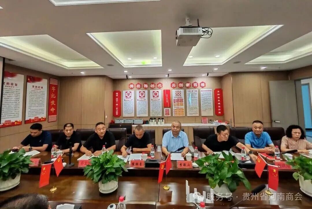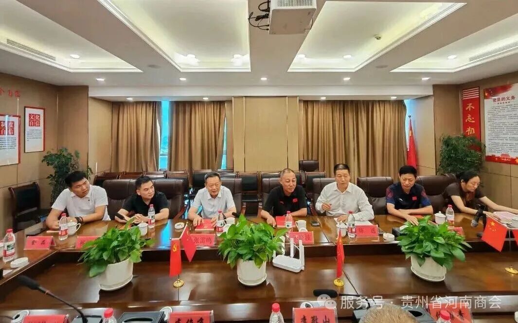 8月31日下午,湖南省河南商会会长陈通一行莅临贵州省河南商会座谈交流。贵州省河南商会执行会长李敬山、常务副会长高俊京,秘书长侯排青、副会长乔宏兴、张洪瑞、苗江卫,监事毛永玲及理事刘武玮、金品等热情接待,特邀贵州省陕西商会秘书长赵利虎出席,会议由侯排青主持。
