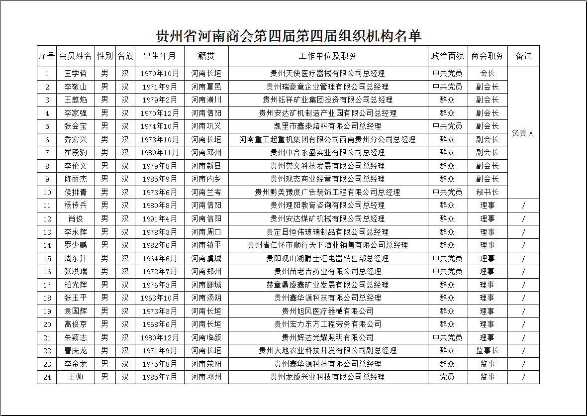 贵州省河南商会第四届第四届组织机构名单