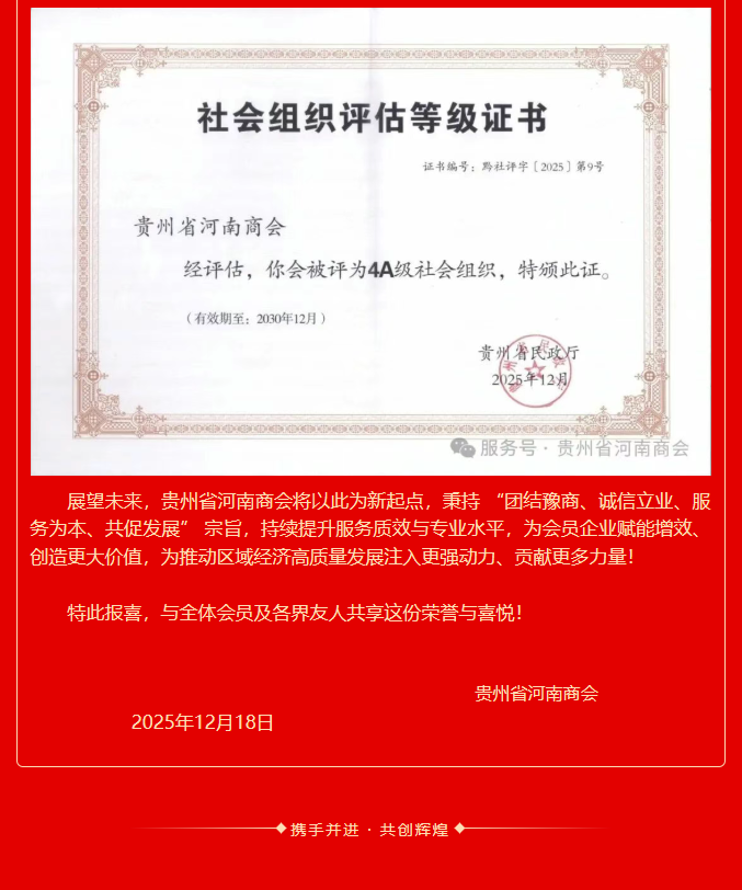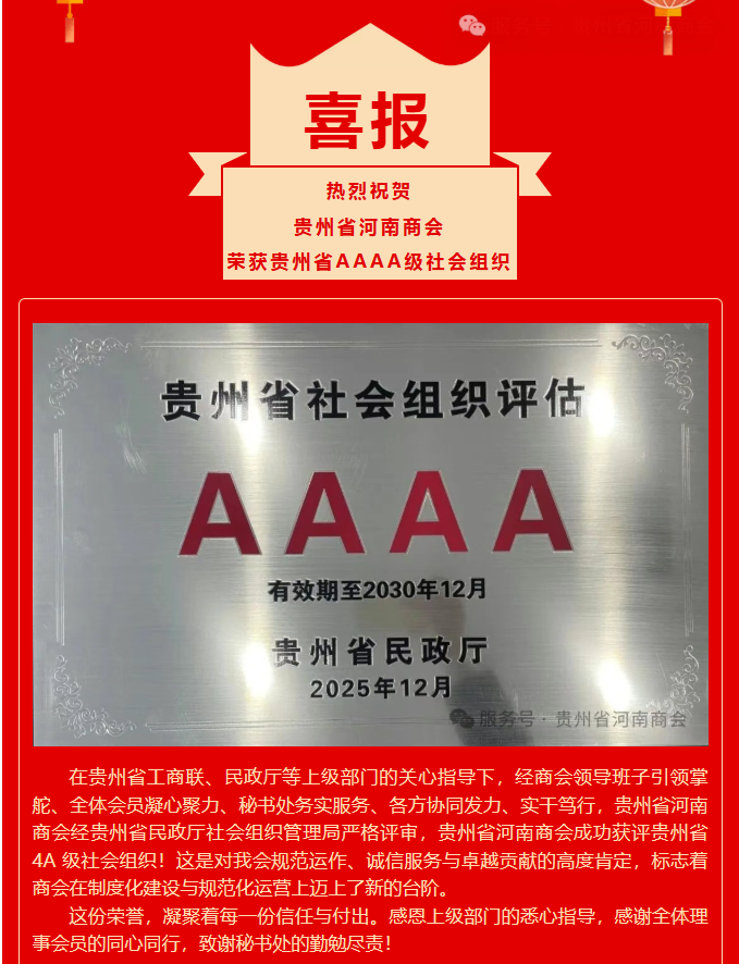 喜报 | 贵州省河南商会荣获贵州省AAAA级社会组织