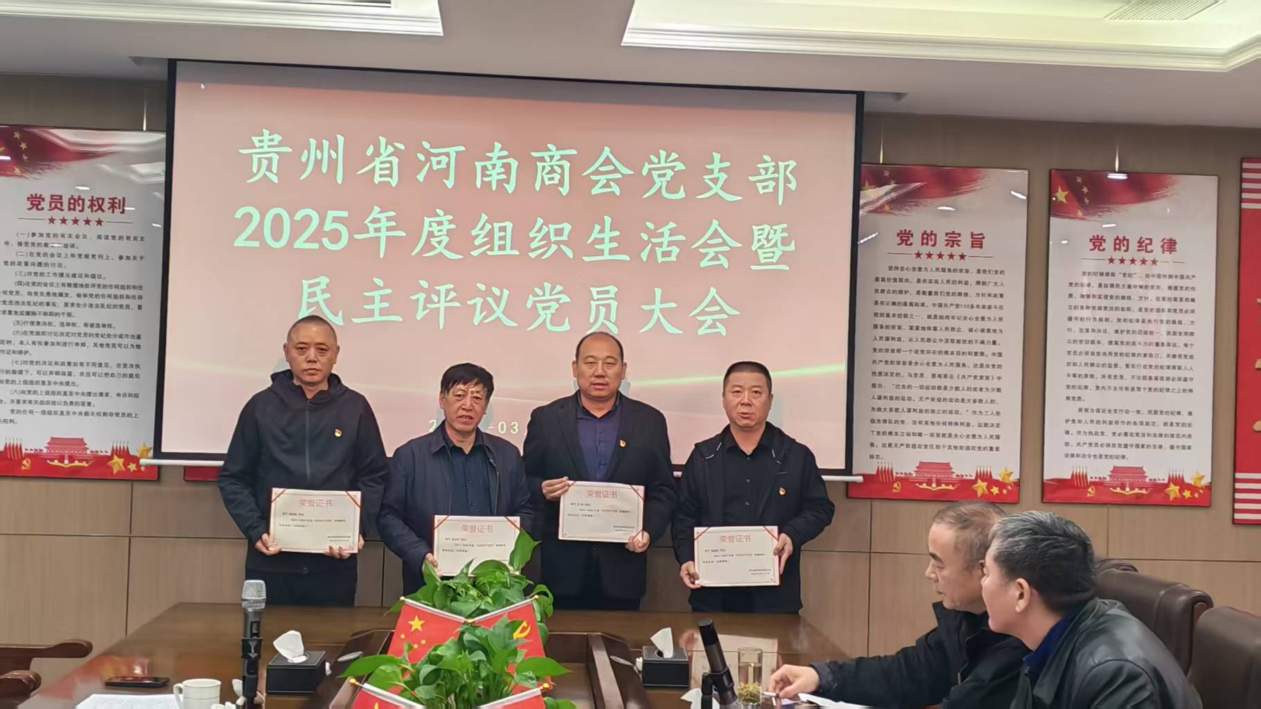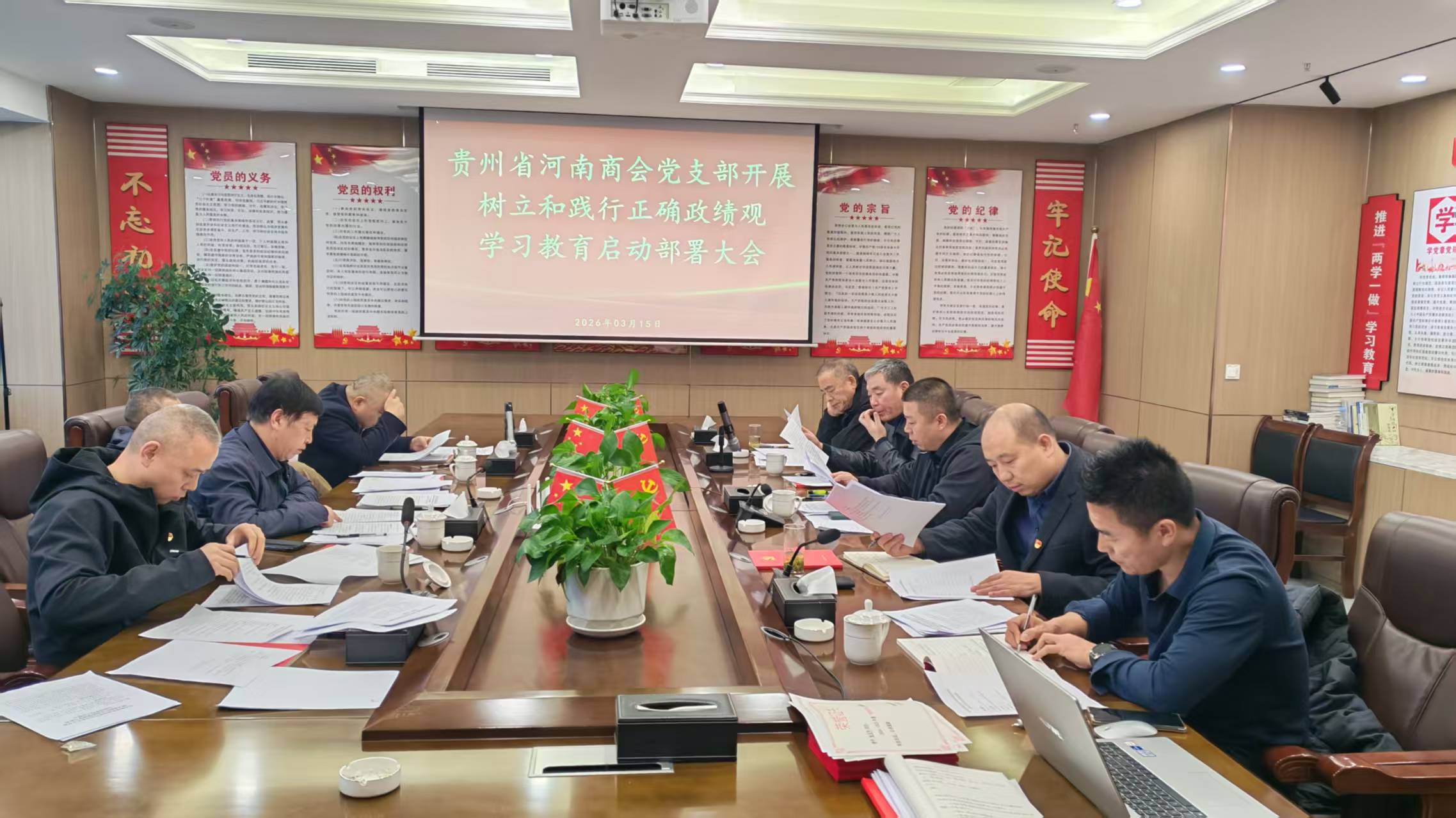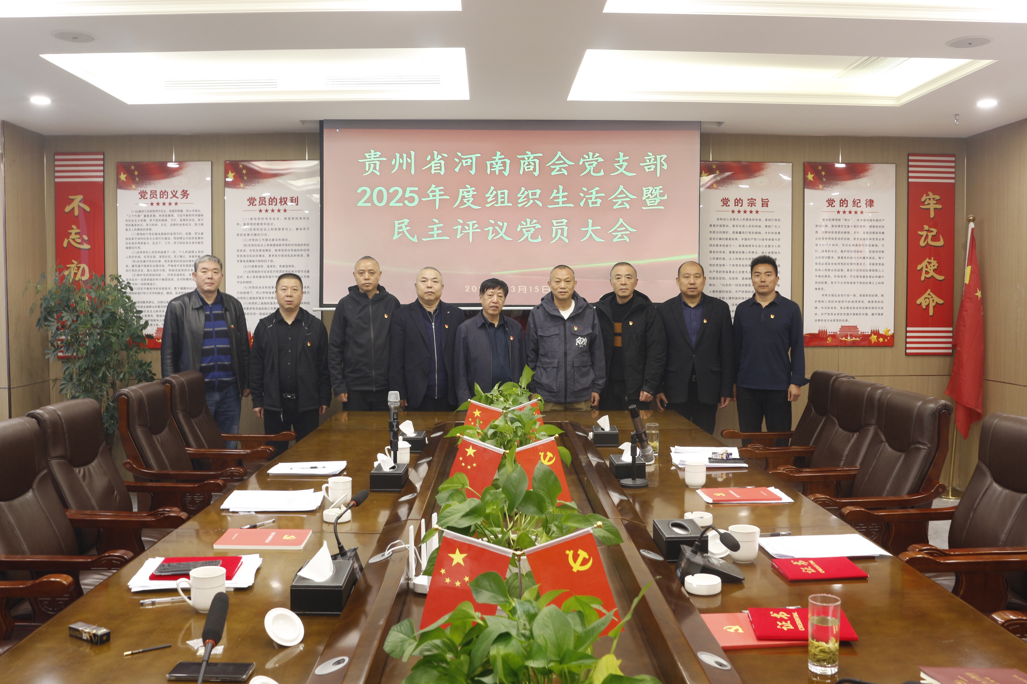 2026年3月15日,贵州省河南商会党支部在会议室召开2025年度组织生活会暨民主评议党员大会。党支部书记张玉平,党员王学哲、李敬山、侯排青、朱颖志、王帅、王俭省、发展对象李金龙参加会议,监事长曹庆龙列席。